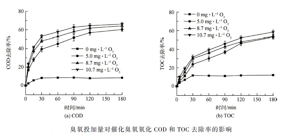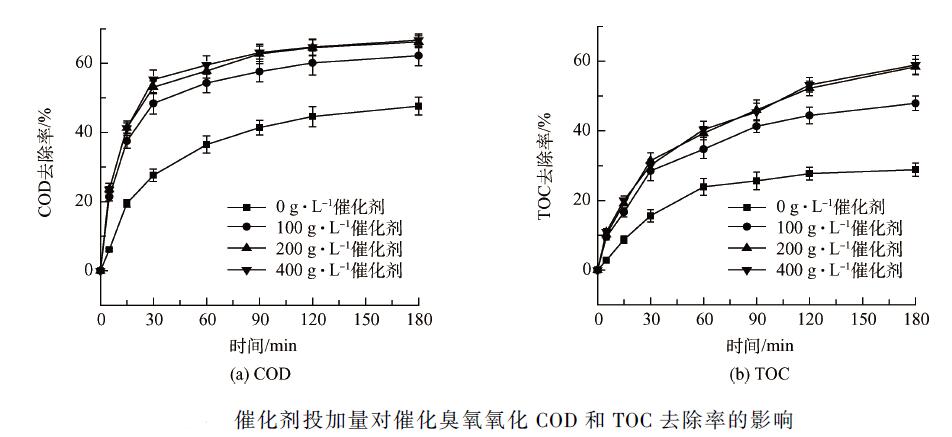臭氧是有機(jī)物降解的直接動力,其投加量直接影響催化臭氧氧化的速率及效果。實(shí)驗(yàn)通過調(diào)節(jié)所用臭氧發(fā)生器電流檔位改變臭氧投加量,并用碘量法測出臭氧產(chǎn)生量。廢水不調(diào)節(jié)pH 值(中性),催化劑投加量為200 g·L - 1 。由圖3 可知,不通臭氧,單純通空氣時(shí),催化劑對廢水只有吸附作用,此時(shí)COD 和TOC 的去除率僅有(8. 6 ± 0. 3)% 和(12. 1 ± 0. 4)% 。增大臭氧投加量對COD 和TOC 的去除率的提有限,這可能與臭氧的利用率有關(guān),有效利用的臭氧較少,但增大臭氧投加量,有利于三相界面的傳質(zhì),反應(yīng)速率更快,特別是在短時(shí)間內(nèi)效果顯著。