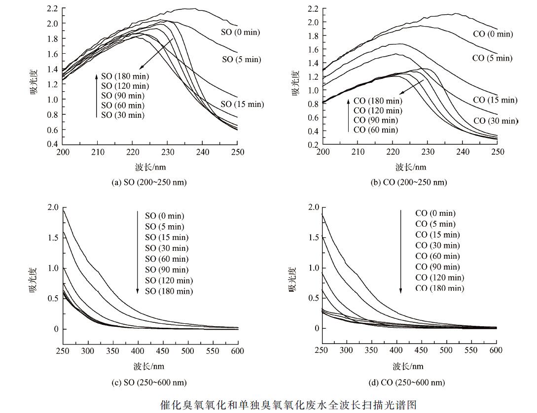 全波長掃描可以反映溶液整體對某一波長光的吸收性,適合分析含多種有機(jī)物的實(shí)際廢水。其中,紫外譜圖提供的是常見官能團(tuán)信息。若溶液在220 ~ 250 nm 波段有強(qiáng)烈吸收,說明該溶液化合物中存在共軛雙鍵(共軛二烯烴、不飽和醛、不飽和酮),否則可能是飽和脂肪烴、脂環(huán)烴或其衍生物;化合物在250 ~290 nm 波段有強(qiáng)烈吸收,說明化合物分子中有苯環(huán)存在(以UV254 為代表);化合物在300 nm 以上有強(qiáng)烈吸收,說明分子中有較大的共軛體系(大分子腐殖質(zhì),以UV410 為代表)。廢水不調(diào)節(jié)pH 值(中性),臭氧投加量為10. 7 mg·min - 1 ,催化劑投加量為200 g·L - 1 。