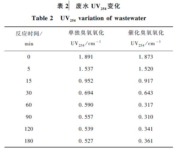 由表2 可知,單獨(dú)臭氧氧化對廢水UV254 的去除率為72. 1% ,催化臭氧氧化對廢水UV254 的去除率為80. 7% ,催化臭氧氧化的處理效果優(yōu)于單獨(dú)臭氧氧化。