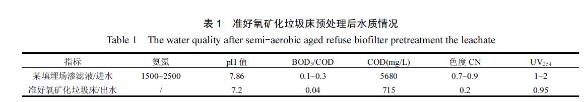 垃圾滲濾液取自中國(guó)西部某大型傳統(tǒng)厭氧型填埋場(chǎng),運(yùn)營(yíng)時(shí)間為20a,其垃圾滲濾液呈深褐,水質(zhì)偏堿性,pH值為7.86,COD為5680mg/L.實(shí)驗(yàn)所用廢水經(jīng)準(zhǔn)好氧礦化垃圾床處理,準(zhǔn)好氧礦化垃圾床裝置已被多次報(bào)道[11],其對(duì)氨氮有十分優(yōu)異的去除性能.滲濾液尾水呈淺棕色,pH 值為7.2,COD 為715mg/L,由于準(zhǔn)好氧礦化垃圾床的微生物作用使得滲濾液尾水的可生化性極差,其水質(zhì)特征如表1所示.