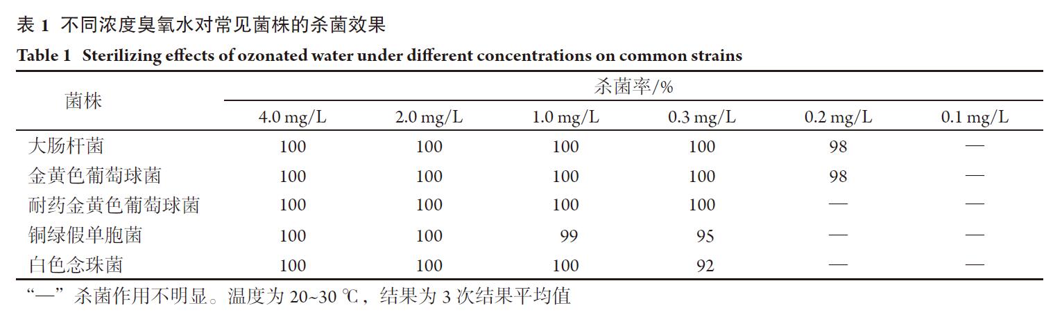 在常溫(25 ℃)常壓下,新制臭氧水作用1 min對標(biāo)準(zhǔn)菌株大腸桿菌(8099 ) 、金黃色葡萄球菌(ATCC6538)、耐藥金黃色葡萄球菌、銅綠假單胞菌菌(9201)、白色念珠菌(ATCC10231)的殺滅率可達(dá)100%;濃度為1.0 mg/L臭氧水作用1 min對銅綠假單胞菌的殺滅率為99%,對其他常見菌的殺滅率為100%。濃度為0.3 mg/L臭氧水作用1 min對大腸桿菌、金黃色葡萄球菌、耐藥金黃色葡萄球菌、銅綠假單胞菌及白色念珠菌的殺滅率分別為100%,100%,100%,95%和92%。濃度為0.2 mg/L臭氧水作用1 min對大腸桿菌、金黃色葡萄球菌的殺滅率均為98%(表1)。
